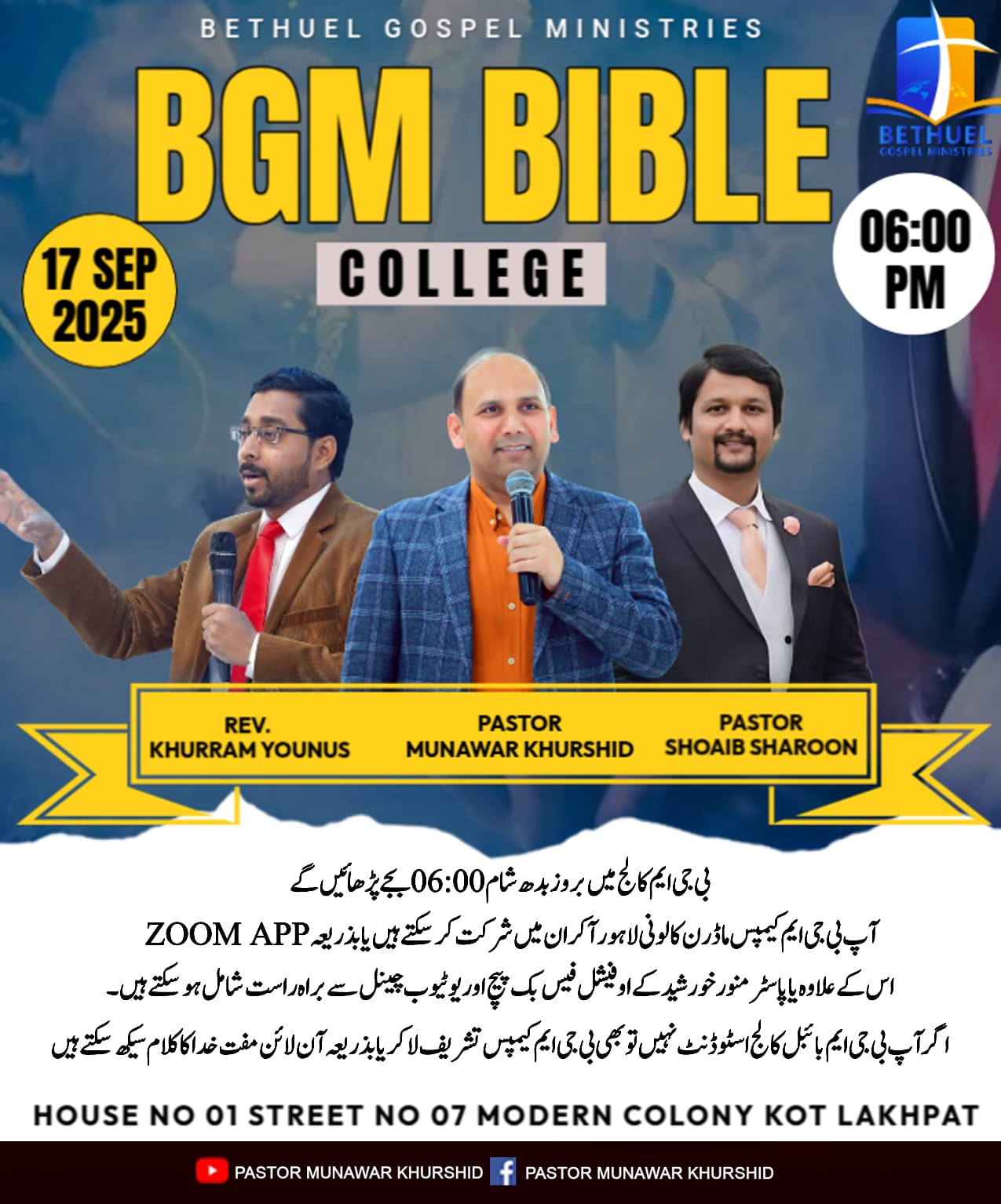 In 2021, God gave a vision to His servant Pastor Munawar Khurshid to spread His Word in a more disciplined way through intentional discipleship. This vision led to the establishment of BGM Bible College, made possible by God’s grace. The college offers both physical classes and online learning opportunities via Zoom, YouTube, and Facebook, enabling students from remote areas, cities, and villages across Pakistan and abroad to access biblical education.